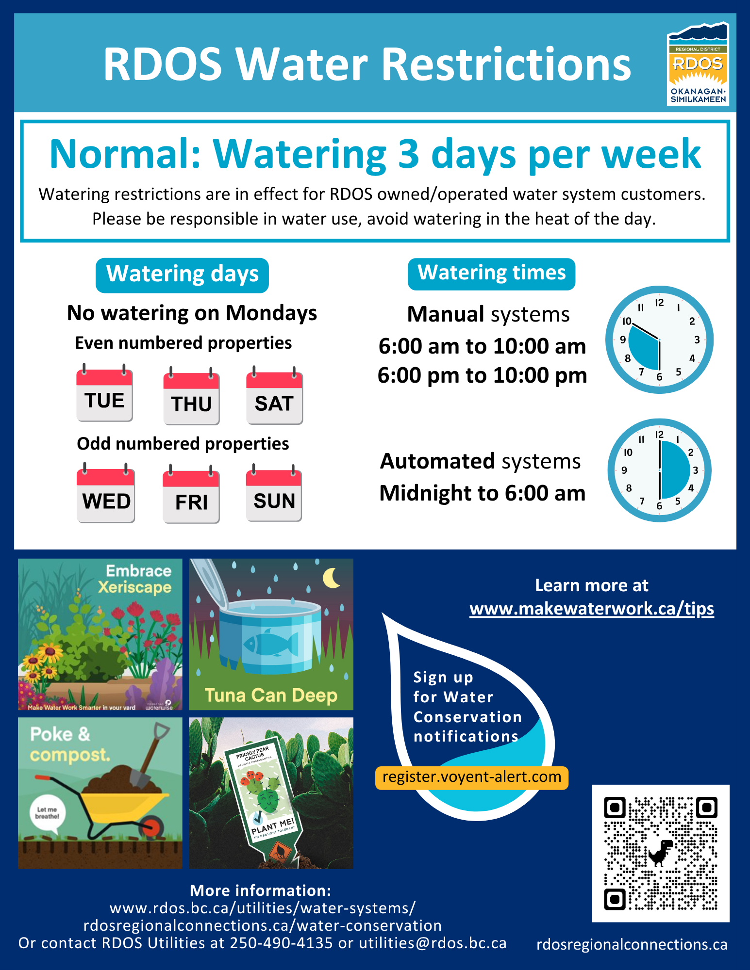 Due to ongoing drought conditions, limited rainfall, and high water demand, the RDOS is moving to Stage 2 water restrictions for affected systems. The RDOS asks all residents in these communities to be mindful of their outdoor water use and to follow the updated watering guidelines. Every drop counts—your cooperation helps protect shared water resources.